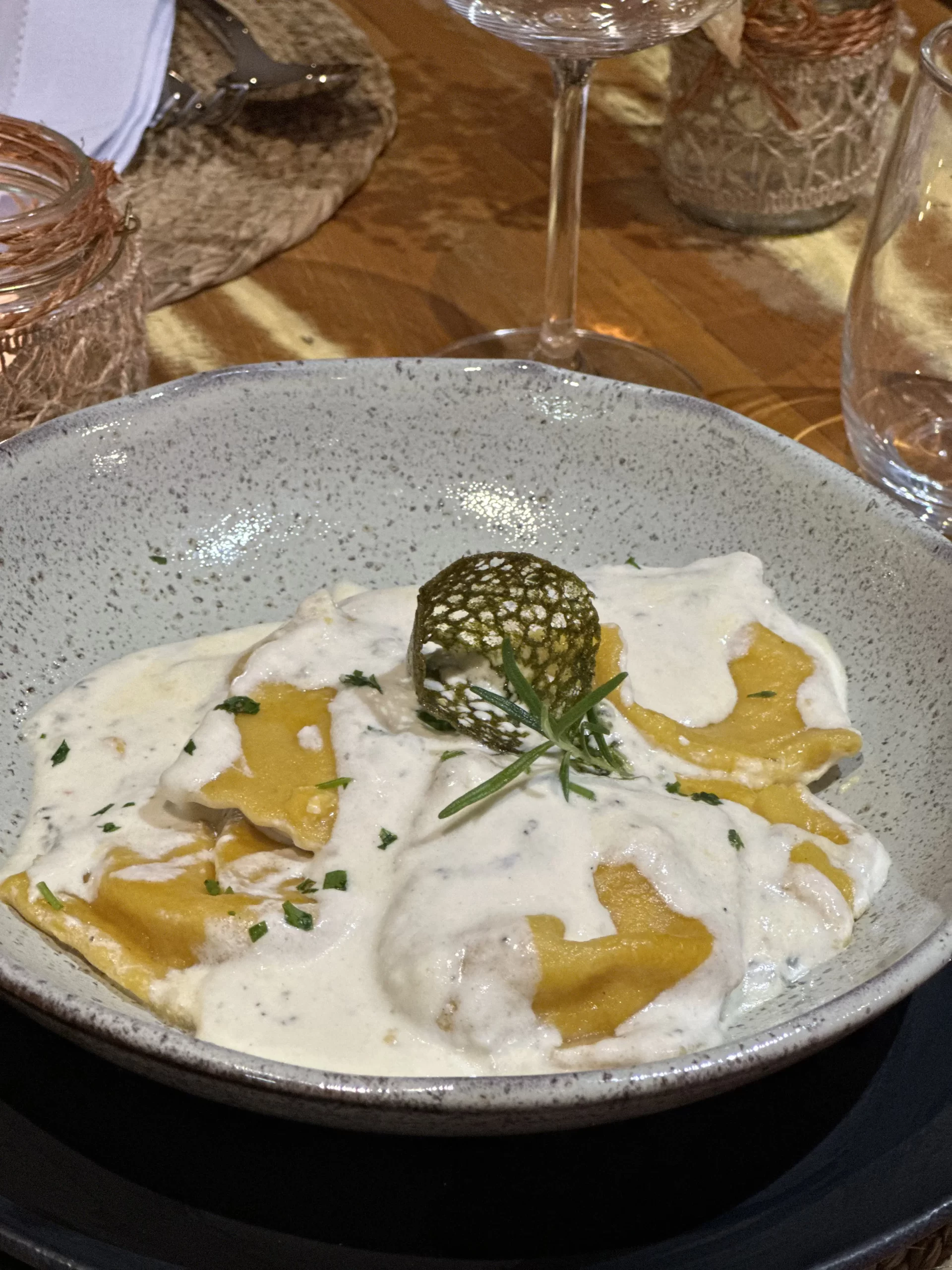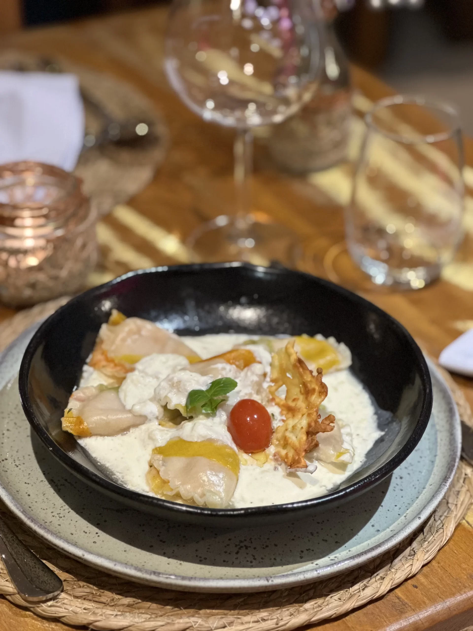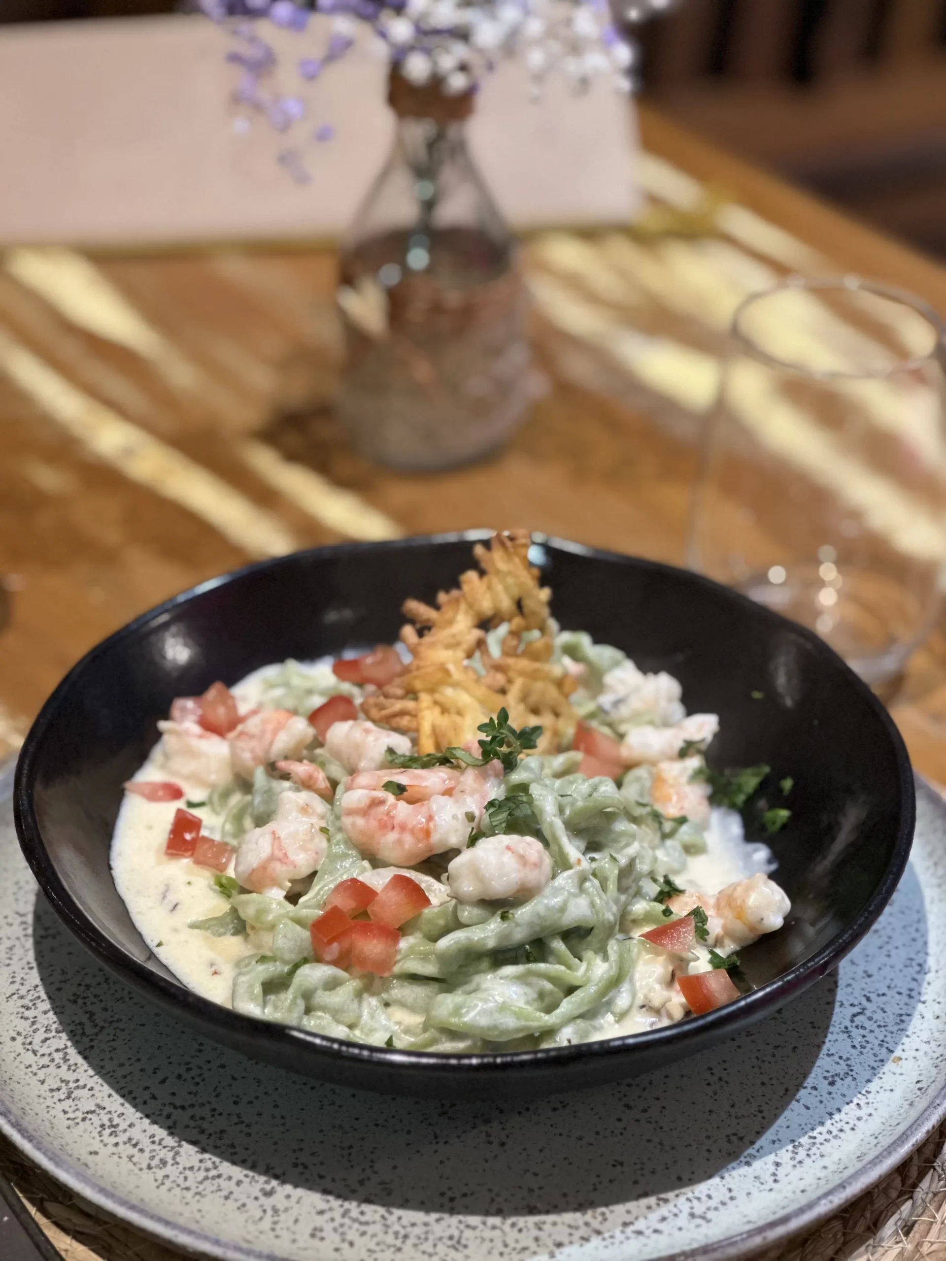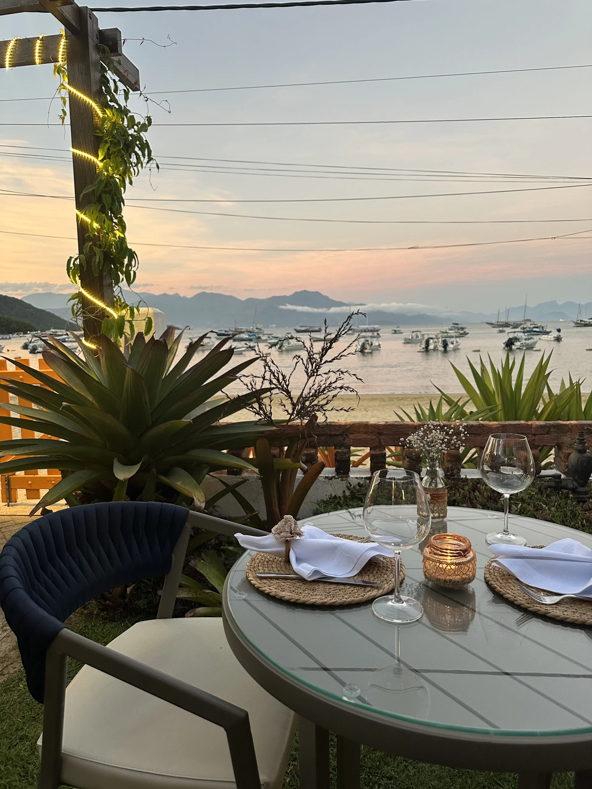 Em um ambiente romântico e intimista, à beira-mar, servimos massas artesanais, com opções veganas e saladas frescas. A carta de vinhos foi elaborada em perfeita harmonia com os pratos, com seleção especial de rótulos nacionais.
